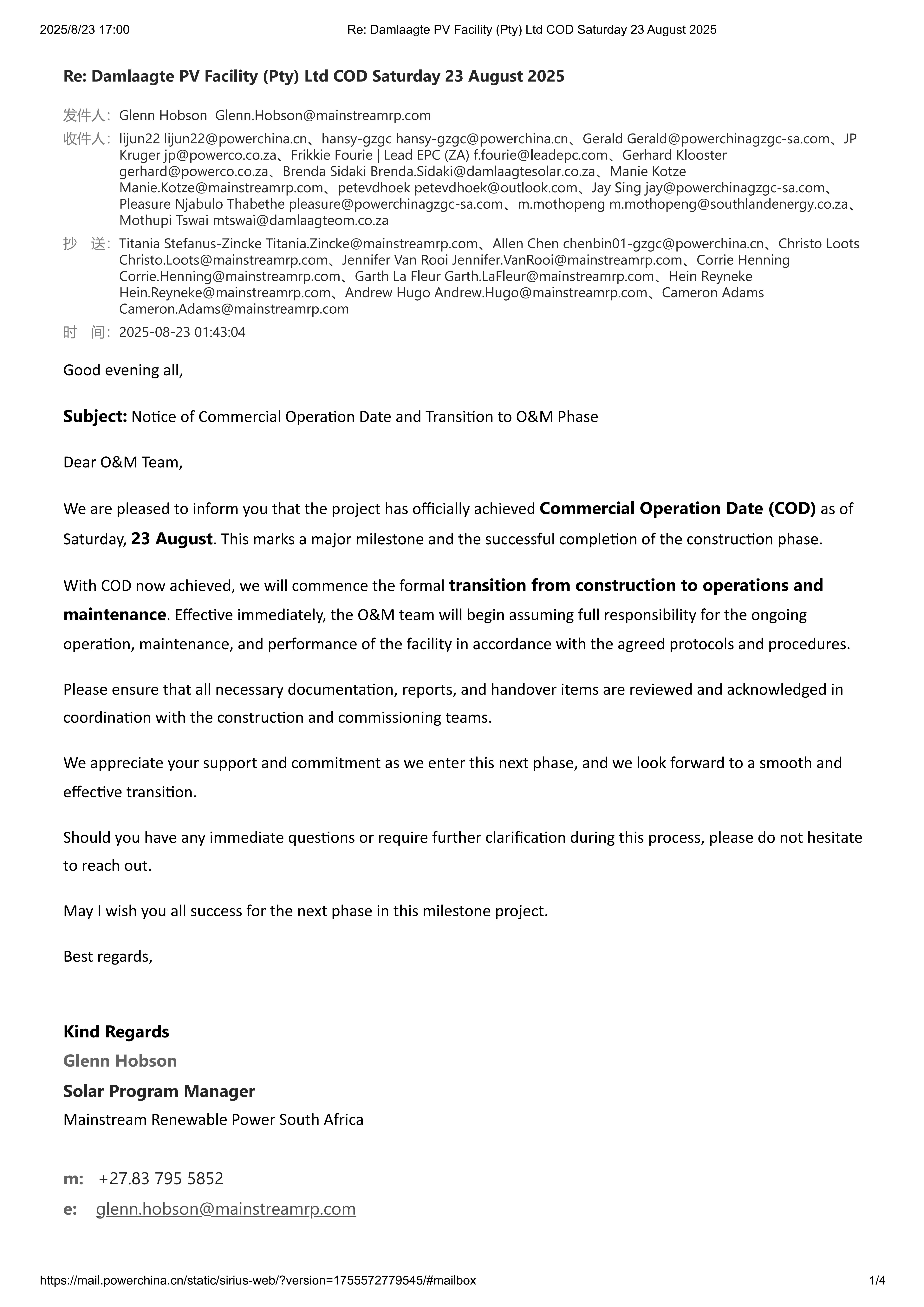 項(xiàng)目業(yè)主方在商業(yè)運(yùn)行日(COD)特別發(fā)來感謝郵件,高度評價(jià)項(xiàng)目團(tuán)隊(duì)在復(fù)雜國際環(huán)境和全球供應(yīng)鏈挑戰(zhàn)下的卓越執(zhí)行力,稱其極具里程碑意義。這不僅是對項(xiàng)目團(tuán)隊(duì)辛勤工作的肯定,也是對中方建設(shè)和履約能力的高度認(rèn)可。